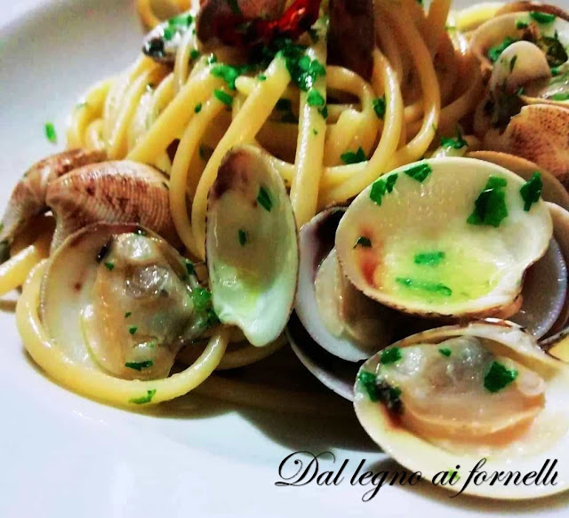 Andiamo subito ad iniziare sciacquando le vongole, eliminando quelle danneggiate o vuote, lasciamole per circa un ora in una soluzione di acqua e sale, trenta grammi di sale per litro di acqua, così facendo elimineremo eventuali tracce di sabbia, torniamo a sciacquarle e teniamole in un contenitore insieme ad un mestolo di acqua salata per chilo di vongole, adesso prepariamoci ad aprirle, padella ampia sul fuoco con dentro un goccio di olio evo, aglio e prezzemolo quando l’aglio sarà dorato sfumiamo con un niente di vino bianco, togliamo l’aglio alziamo la fiamma al massimo e tuffiamo in padella le vongole coprendo subito, dopo due tre minuti scuotiamo la padella e portiamo via il coperchio, aiutandoci con pinze da cucina iniziamo a togliere le vongole una ad una man mano che si aprono, sarà questa operazione infatti che oltre ad evitare al cento per cento la presenza di granellini di sabbia, ci farà apprezzare il gusto dei mitili morbidi e succosi, pensate che un solo minuto in più di cottura potrebbe gia renderli gommosi e asciutti, terminata questa operazione continuiamo filtrando tutto il liquido presente con un colino a maglie strette, tenendolo da parte, portiamo a bollore abbondante acqua e dopo aver appena salato di un niente caliamo la pasta, nel mentre prepariamo il condimento, padella ampia sul fuoco con olio evo, gambi di prezzemolo finemente tritati e aglio, lasciamo dorare a fiamma dolce, togliamo l’aglio e versiamo il liquido filtrato ottenuto dall’apertura delle vongole, appena la pasta e pronta sempre molto al dente scoliamola grondante direttamente in padella, aggiungiamo anche le vongole, parte delle quali abbiamo provveduto a privare delle valve e saltiamo il tutto per amalgamare e insaporire, una spolverata di trito fine di prezzemolo e impiattiamo, guarniamo a questo punto con del peperoncino fresco, sempre e solo per chi piace e serviamo ben caldo, ed anche per questa ricetta siamo giunti all’assaggio, augurandovi buon pranzo Flaviano alias dal legno ai fornelli vi saluta e vi dà appuntamento alle prossime ricette, da seguire sul blog di cucina www.dallegnoaifornelli.com