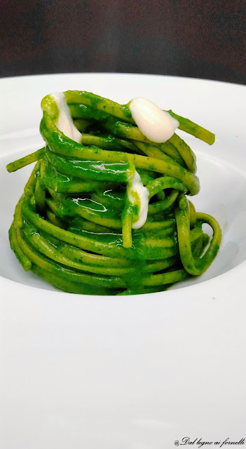 Linguine risottate al succo di verdure di campo, guarnite con crema di pecorino.