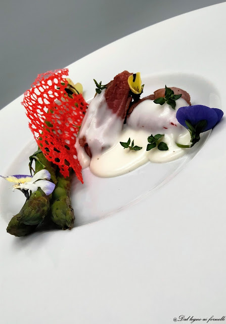 Petto di piccione e asparagi con salsa suprema e cialda corallo.